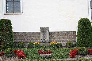Gedenkwand an der Kirche; zusätzlich Hinweise zu Soldaten von privaten Gedenksteinen