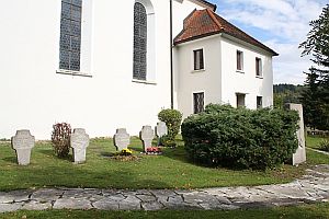 Im Friedhof Steinkreuze vor der Wallfahrtskirche Maria Deutstetten, für jedes Kriegsjahr ein Steinkreuz;