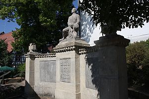 Bei der Kirche eine leicht gebogen Gedenkwand; oben Steinplastik „knieender Soldat“;