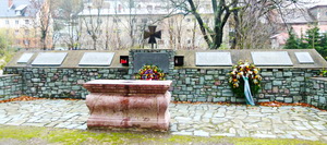 Auf einer aus Natursteinen gefügten Mauer zwischen Friedhof und Kirche sind auf der schrägen Oberseite Metalltafeln mit den Namen der Gefallenen befestigt. In der Mitte der Wand steht auf einem Podest ein EK aus Metall und davor ein altarähnlicher Marmorblock.