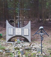 Auf einem oben und unten halbkreisförmig ausgeschnittenen Betonblock befindet sich ein Metallkreuz und darunter drei Metalltafeln mit den Namen der beim Flugzeugabsturz ums Leben gekommenen sowie ein Edelweiß. Schräg davor steht ein Metallkreuz mit Stahlhelm. Durch eine Tafel auf der Straße zum Hochwechsel ist ein Fußweg markiert der, nach etwa 500m, zu dem im Wald stehenden Denkmal führt.