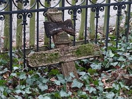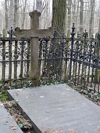 mit Eisernen Kreuz versehene Holzkreuze sind schräg an die Umfassung der Grabstelle von Familie von