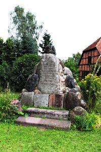Waschow, Gemeinde Wittendörp, Landkreis Ludwigslust-Parchim, Mecklenburg-VorpommernPLZ 19243 Findling mit angesetzten Feldsteinen an der Dorfstraße