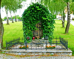 Zum Großteil mit Efeu überwuchertes mit Metallzaun eingefriedetes Monument unterhalb der Kirche.