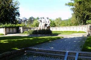 In der Mitte einer Rasenfläche befindet sich eine Figurengruppe auf einem Podest, die drei marschierende Soldaten zeigt. Die Rasenfläche wird von einer Mauer umfasst, in der die Namensplatten eingesetzt sind. Im mittleren Teil der Mauer befinden sich die Namenstafeln des 1. Weltkrieges.