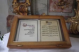 In der Klosterkirche St. Peter und Paul an einem Seitenaltar Gedenkbuch in ein Vitrine (geschlossen, aufgeschlagen Monat April)