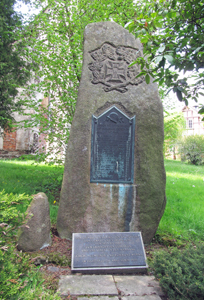 Natursteindenkmal mit aufgesetzter Metallplatte vor der Ortskirche St. Johannis