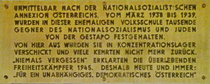Unmittelbar nach der nationalsozialistischen Annexion Österreichs vom März 1938 bis 1939 wurden in dieser ehemaligen Volksschule tausende Gegner des Nationalsozialismus und Juden von der Gestapo festgehalten. Von hier aus wurden sie in Konzentrationslager verschickt und viele kehrten nicht mehr zurück. „Niemals vergessen“ erklärten die Überlebenden Freiheitskämpfer 1945. Deshalb heute und immer: „Für ein unabhängiges, demokratisches Österreich“
