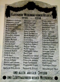 Hadersdorf Weidlingau seinen Helden 1914 – 1918 (Namen) und allen anderen Opfern und Leidtragenden beider Weltkriege