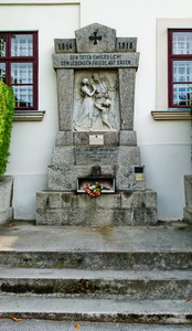 Denkmal mit Relief eines Soldaten mit Frau und Kind an der