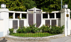 Ovale Wand mit schildförmigen Mittelteil mit Namenstafeln aus Metall in der Anto-Böck-Gasse neben der Kirche.