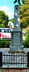 Stele mit Metallzauneingfriedet am Dorfplatz.