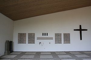 Im Friedhof Tafeln an der Abdankungshalle, seitlich davon zwei Gedenksteine zu Soldaten und ein einzelnes Soldatengrab.