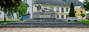 Plastik eines auf die Arme gestützten liegenden Mannes auf mehrstufigen Sockel am Kirchenplatz.