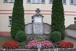 Im Friedhof; Denkmal, mittlerer Teil erhöht, Bildrelief „Engel schauen auf gefallenem Soldaten“, Inschriften
