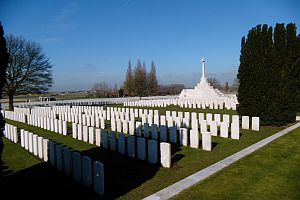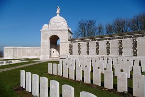 Die Kriegsgräberstätte Tyne Cot ist die größte englische Kriegsgräberstätte des 1. Weltkriegs. Inmitten von fast 12 000 Grabsteinen für gefallene Engländer und umringt von den riesigen Wänden mit Namen von 35 000 vermissten Engländern sind ein bekannter und drei unbekannte deutsche Soldaten bestattet.