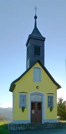 Wandplaketten beiderseits des Eingangs der Dorfkapelle und Bildtafeln im Inneren der Kapelle.