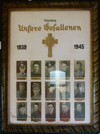 Zur Ehre unseren Gefallenen im Weltkriege 1939 1945 (Namen) Schirmend die Heimat gabt Ihr das Leben, ewigen Sieg hat Gott Euch gegeben. Und die Heimat, ob fern Ihr auch ruht, nimmt Eure Namen in ewiger Hut.
