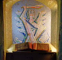 Gedenktafeln für den 1. Weltkrieg an der Außenfront des Rathausturmes und in einem mit Mosaiken gestalteten Gedächtnisraum des Turmes liegt ein Buch aus Leder und Metallplatten mit den Namen der Gefallenen aus dem 2. Weltkrieg auf.