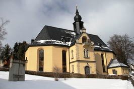 Das Denkmal befindet sich rechts auf einer Wiese vor der Kirche.