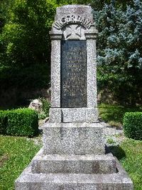 Quadratische Steinsäule mit drei eingesetzen Gedenkplatten sowie einer Inschriftenplatte aus Marmor. Über den Tafeln jeweils ein Deutsches Kreuz aus der Säule hervorgehoben.