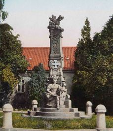 einer reichverzierten Säule und der Figur eines germanischen Kriegers mit Flügelhelm und Schild. Dieses musste nach 1945