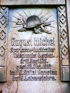 August Michel Sparkassen-Buchhalter Telphonist b.schw. Arttl.Regt.129. gest.18.Dez.1918 im Mil.Spital Komotau im 19.Lebensjahre.