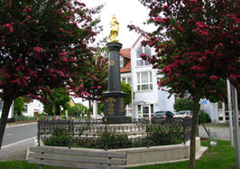 Das Granit-Denkmal auf dessen Spitze eine goldene Maria mit Kind steht, befindet sich in einer kleinen Grünanlage in der Ortsmitte.