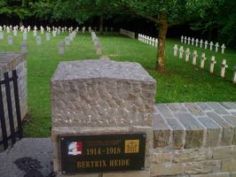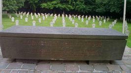 Kriegsgräberstätte für deutsche und französische Gefallene des 1. Weltkriegs, zentraler großer Stein-Sarkophag, in der Mitte deutsche Gräber, umrandet von französischen Gräbern