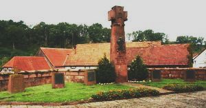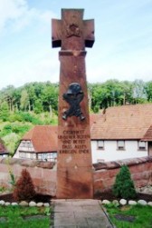 Ganz links aus Sandstein ein Gedenkstein mit Kreuz obendrauf für die Opfer der Schlacht von Bundenthal (dieser ohne Namen)