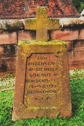 Auf dem Gedenkstein für die Schlacht von Bundenthal: ZUM ANDENKEN AN DIE IN DER SCHLACHT V. BUNDENTHAL 12.-14.9.1793 GEFALLENEN R. I. P.