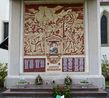 An der Außenwand der Kirche befindet sich geschützt durch ein vorspringendes Dach ein Sgrafitti mit Kriegsszenen darunter Wandplaketten mit den Namen..