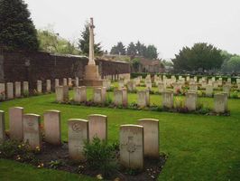 Die kleinere britische Kriegsgräberstätte liegt auf dem großen städtischen Friedhof in der Rue Presbytere. Die deutschen Kriegsopfer scheinen alle nach Kriegsende in Gefangenschaft verstorben zu sein. Zusätzliche Informationen in Blau vom Volksbund Deutsche Kriegsgräberfürsorge: www.volksbund.de/graebersuche