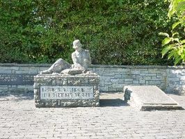 Eine sitzende Soldatenfigur auf einem gemauerten Podest. Daneben eine Gedenktafel. In der Mauer dahinter sit eine weitere gedenktafel angebracht. Seitlich daneben stehen zwei Steinkreuze.