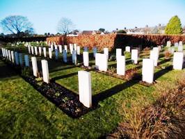 Kriegsgräberstätte auf dem Gemeindefriedhof, sondern sind mitten unter den britischen Gräbern eingebettet.