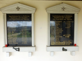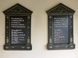 Hölzerne bzw. steinerne Tafeln auf dem Friedhof von Degersheim im Vorraum der dortigen Leichenhalle