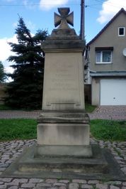 Sandsteinobelisk mit eisernem Kreuz als Abschluss. An den vier Seiten Inschriften und Namen der