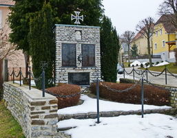 Aus Bruchsteinen gefügte Wand gekrönt mit Eisernen Kreuz am Dorfplatz