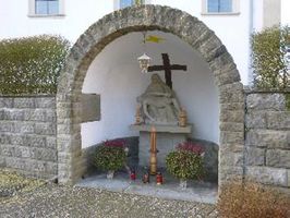 In der Umfassungsmauer der Kirche Mariä Himmelfahrt ist eine kleine Grotte eingefügt. Darin ein Altar mit einer Sterbeszene. An den Wänden rechts und Links sind Gedenktafeln angebracht.