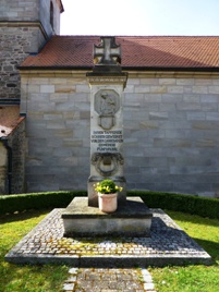 Ehrenmal direkt vor der Kirche. Stele mit Tatzenkreuz obenauf. Vorne, über einem bayerischen Wappen, die Skulptur eines