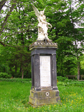 Quelle: fuerthwiki.de: Das Grab-Denkmal von 1872 wurde zum Andenken an die sechs in Fürth verstorbenen Soldaten des Deutsch-Französischen Krieges von 1870/71 im heutigen Stadtpark aufgestellt. Auf einem hohen Postament aus Sandstein befindet sich eine Terrakotta-Statue der sitzenden Siegesgöttin Victoria. Vorbild der Terrakotta-Statue ist die klassizistische Marmorstatue „Kranzwerfende Viktoria“, die der Bildhauer Christian Daniel Rauch in den Jahren 1838 bis 1845 schuf, und die sich früher im Berliner Stadtschloss befand. Auf der Vorderseite des Sandsteinsockels ist eine Inschriftenplatte aus schwarzem Marmor angebracht, welche die sechs Soldaten verzeichnet, die hier in gemeinschaftlichem Grab ruhen
