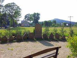 Ein Gedenkstein mit Gedenkworten der Gemeinde und zwölf Gedenksteine (je einer pro Gefallenen oder Vermissten oder an den