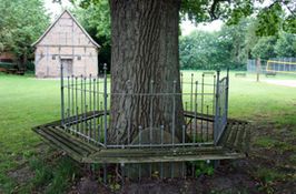Ganderkesee-Bürstel (1870/71), Landkreis Oldenburg, NiedersachsenPLZ 27777 Eiserner Zaun um eine Eiche und ein Gedenkstein, in Bürstel bei der alten Schule. Denkmal ohne Namen.