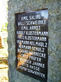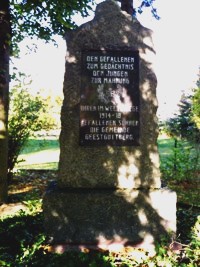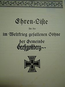 Denkmal: Den Gefallenen zum Gedächtnis den Jungen zur Mahnung.  Ihren im Weltkriege 1914 – 1918 gefallenen Söhnen Die Gemeinde Geestgottberg. Ehrenliste: Ehren-Liste für die im Weltkrieg gefallenen Söhne der Gemeinde