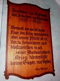 Tafel 2. Weltkrieg: Den Toten zum Gedenken, den Lebenden zur Mahnung 1939-1945 Niemand von uns ist in der Lage, den Krieg auszurotten, aber unsere Pflicht ist es, ihn zu denunzieren und bloßzustellen in all seiner Abscheulichkeit. Krieg hinterläßt keine Sieger, nur Opfer. Elie Wiesel