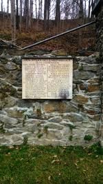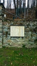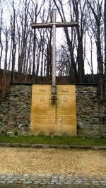 Gedenktafeln an Steinmauer und großes Holzkreuz auf dem Friedhof