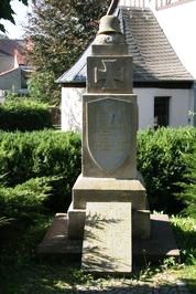 Stele vor der ev.-luth. Kirche für die Gefallenen des 1. Weltkrieges, ergänzt mit einer davor liegenden Tafel für die Opfer des 2. Weltkrieges