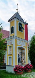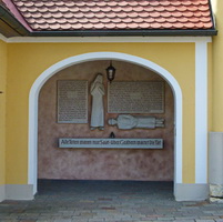 Rechteckiger nach unten sich leicht verjüngender Marmorblock gekrönt mit der Statue eines sitzenden und hinter ihm stehenden Soldaten vor der Wallfahrtskirche Maria Helfbrunn. Daneben eine kleine Zusatztafel.