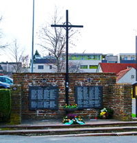 Hohes Metallkreuz vor einer Bruchsteinmauer mit Namenstafeln links und rechts davon, an der Ecke Waltendorfer Hauptstraße – Dr. Robert Graf Straße.