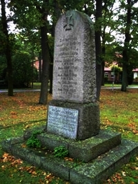 Denkmal für die Gefallenen des 1. Weltkriegs: abgestufter Sockel mit aufgerichteter Granitplatte und später davor